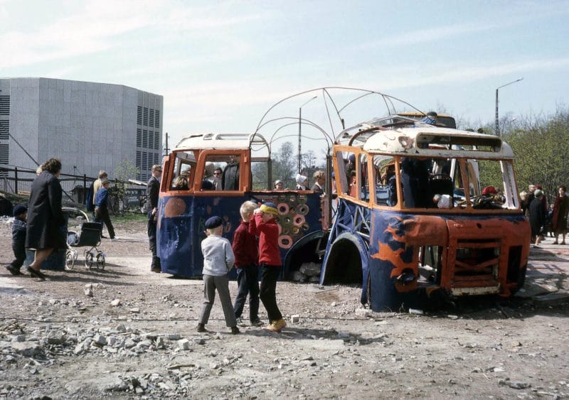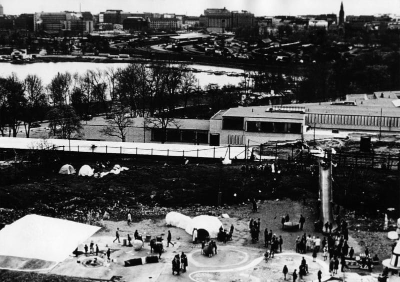 In his teaching, Franck saw an opportunity to openly question the role that tangible materials play in the design process. In 1966, he asked his students to build temporary shacks for the homeless in Jätkäsaari, then a derelict area on the Helsinki coast line, out of materials claimed from a refuse dump where building companies left their waste. The following year, Franck’s students built a playground for children in a derelict area in Kallio, employing a discarded bus, papier mâché and pastry dough, to name a few. Another assignment asked the students to build sculptures out of snow. The brief emphasized freedom from the pressures of wasting precious material or creating something everlasting. The fact that the works would melt away highlighted the importance of the process and the feelings it evoked in the makers.