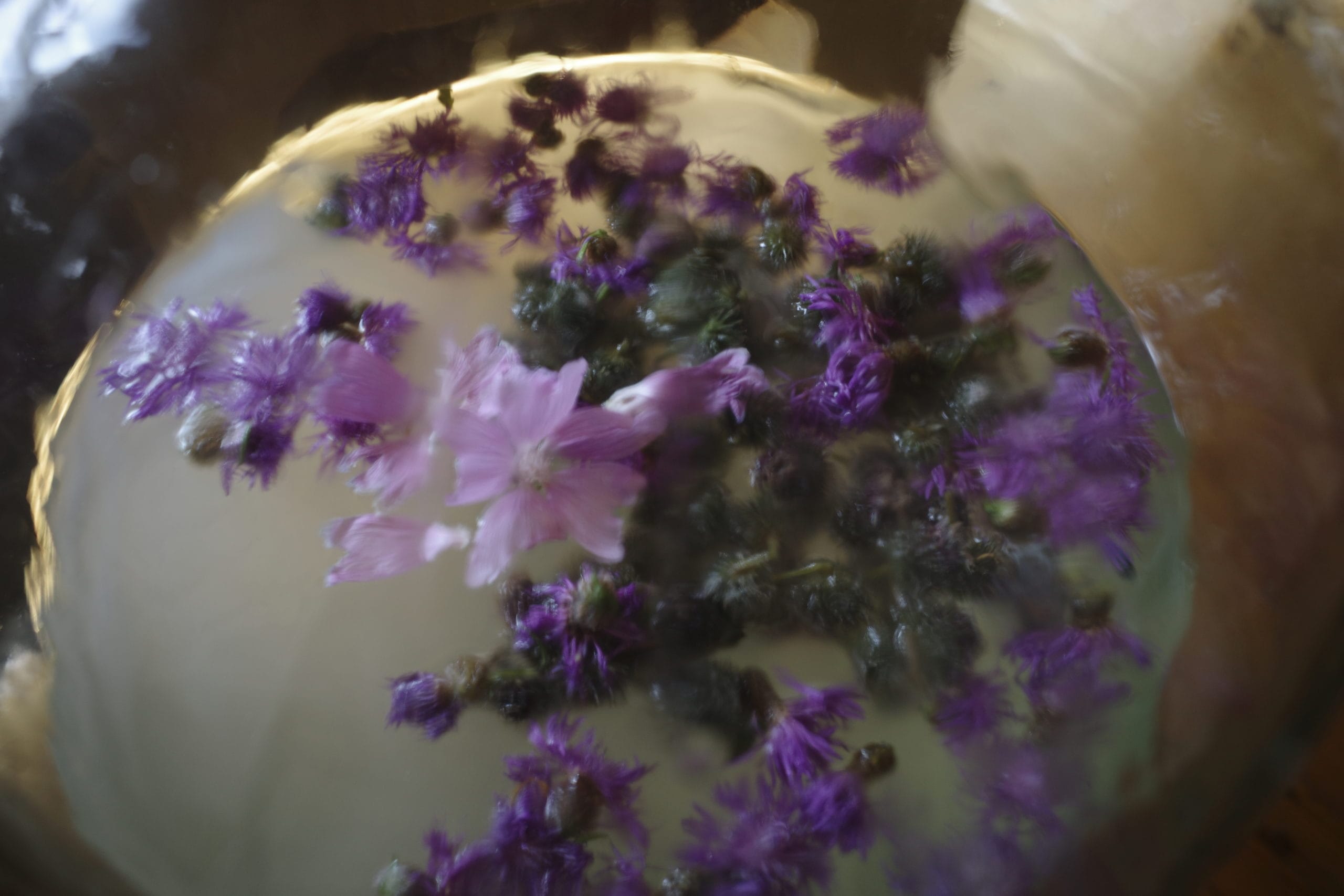 Textile works by Eeva Rönkä. The wine is Eeva and Jani’s summer home wine brewed at HIAP studios from flowers (malva, thistle and burdock) and tart cherry. Photo by Sheung Yiu.
