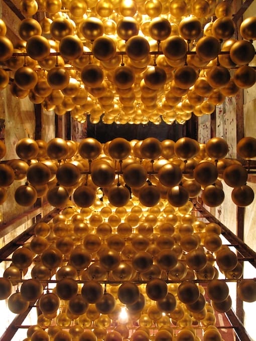 “According to the old family book, the village has a history dating back more than 1000 years, traceable to the Song Dynasty. Numerous important scholars and literati originally came from the village, and the poems they wrote were recorded in the family book. One set of poems describes ten bits of scenery from around the village, all situated along Mei creek. They include Stone horse carrying the mist and Snow covering the bamboo forest next to Mei creek… Time has passed, Mei creek is still flowing, but the scenery has long gone, and has been transformed into scenes of white foam, red balls, green tinsel, and many of the ornaments we see today. In fact, this village now produces more than 50% of China’s Christmas exports. All of them are handmade, some designed and invented by the villagers themselves, even though most of the tools they use to make these Christmas decorations are farming-related implements. Magically, they managed to mix and match these agricultural tools perfectly to suit their production!” Chen Hangfeng