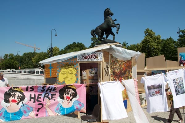 Timofei Radya (b. 1977) is from the youngest generation of new Russian street artists, for whom taking risks in a repressive society is a normal part of artistic life. Nevertheless, his at times small-scale, at times monumental works, have often been accepted by public authorities as part of the urban landscape. Like when he and his group illicitly painted a large bridge in the heart of Ekaterinburg (http://t-radya.com/street/14/). We are looking forward with hope and trepidation to seeing what he will develop in Helsinki.