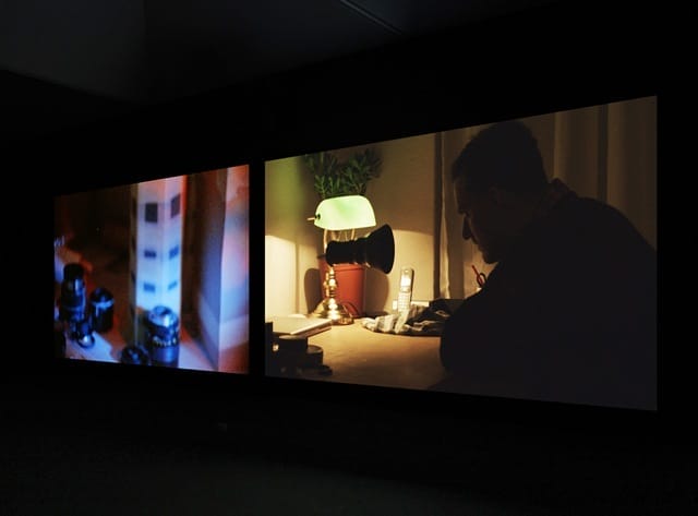 Cameraman, shot on location in Berlin, is a two-channel video installation that presents a sequence of events which take place between a film set, a cameraman’s apartment and an artist’s studio. The fractured narrative involves two camera lenses – one real and one sculpted by the artist. One channel of video conveys the action of the film set and its protagonists; the other interweaves the perspective of the film being shot – the ‘film within the film’. The work links celluloid film, sculptural practice and video installation through narrative cinematic form. The protagonist’s experience is one of traversing the realities of multiple screen-worlds, and registering the slippages between them.