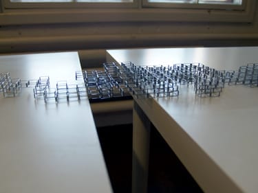 A grid is a pattern of vertical and horizontal lines crossing each other and forming squares, as is found in a perfect Newtonian world. It can be perceived as a network connecting knots, an image revealed by recurring cells or interlacing lines, a transparent wall, a physical barrier or a conceptual formation extending through the perimeters of matter. Jung-joo Kim´s exhibition can be seen an experiment on grid-like structures with an intention to get variant results.