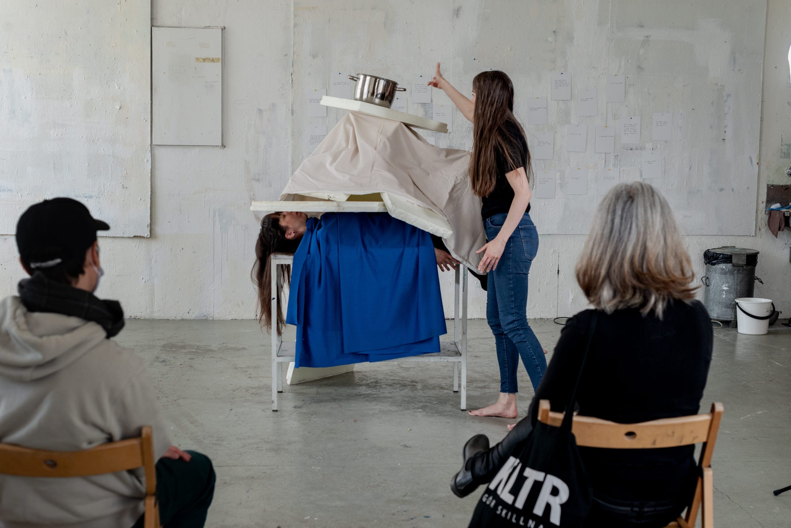 The performance duo started as a side project, and Linda and Aura describe those early days as “being in a band,” having fun while making other, more serious work at the same time. These days the duo’s work has deepened in meaning and thought, and is no longer all fun and games, while at the same time keeping an element of joy and experimentation to it. While the nature of the collaboration has grown from a side project to a career, some topics and themes have stayed with them throughout the years. The different roles and spaces that women occupy and the female body, for example, are themes that find new meaning with age. In the early days, Linda and Aura did not feel the need to use the nude form, but as they get older and go through experiences such as pregnancy and giving birth, nudity has acquired new meanings and their relationship with their own body has changed. Times are different too, they feel, and are happy to notice that new generations are braver and more eager to break taboos.