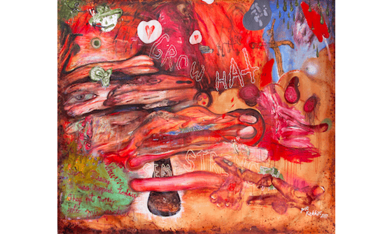 Jyrki Riekki’s paintings are terrifically loud, energetic and furious. They are filled with critical power, alloyed with a genuine talent for painting. It is obvious that Riekki also works with performance, movements, exclamations and script. And beneath that script there lies a carnality that can be reminiscent of baroque painting. But cut and shaken up for our own brutal, frightening age; an age that Riekki ruthlessly continues to lambast in his three-dimensional objects, often with a streak of scorching black humour. – Måns Holst-Ekström, Art critic
