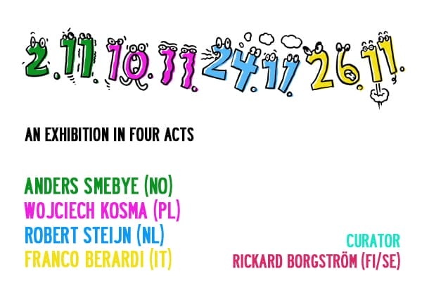 In 2012 in Helsinki Borgstörm is presenting an exhibition 2.11 10.11 24.11 26.11 – An exhibition in four acts including Anders Smebye, artist; Wojciech Kosma, Artist; Robert Steijn, Choreographer and Franco Berardi, Author. The exhibition is on view at Sinne on November 2, 10, 24 & 26