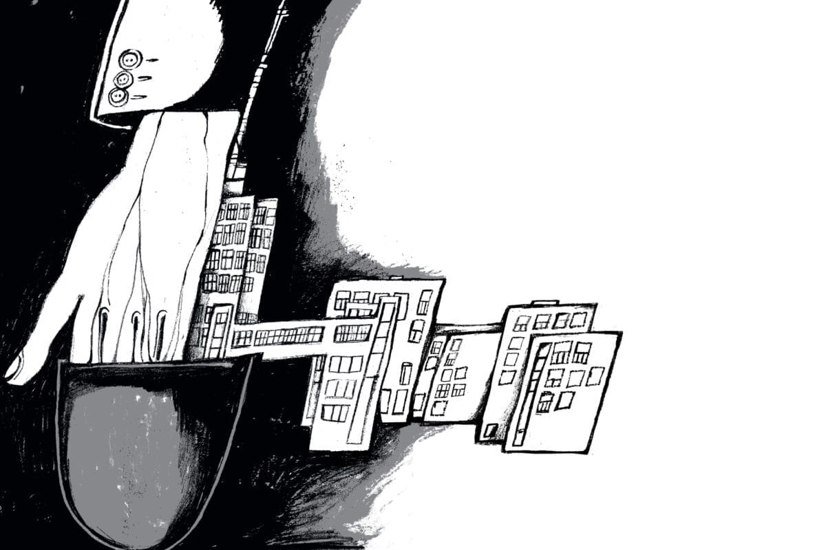 In her work, she uses mostly traditional materials, like pencil and ink, combined with digital.