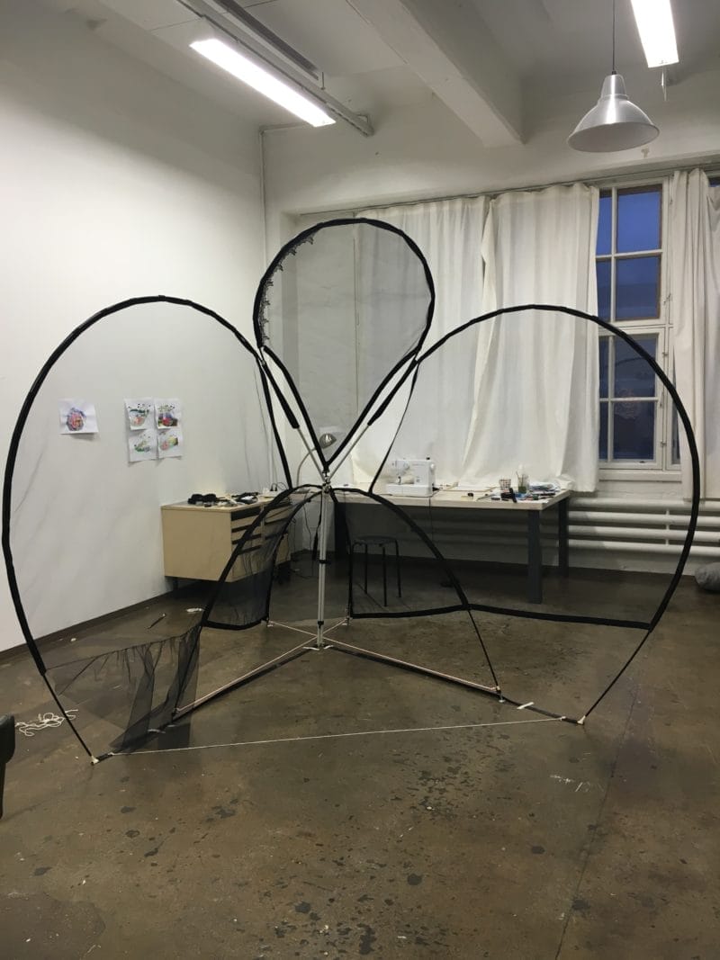 Sofia has also recently found a new interest in performance art. While previously her works could go through a transformation by themselves, now Sofia also considers putting herself on stage. This makes sense as her work is extremely physical. The tent sculptures demand a very tangible relationship between the material and the artist. Creating the sculptures almost looks like a performance, as Sofia uses her whole body to hold things in place while fixing others, bending the pole sticks, dealing with the sculpture’s material tension.